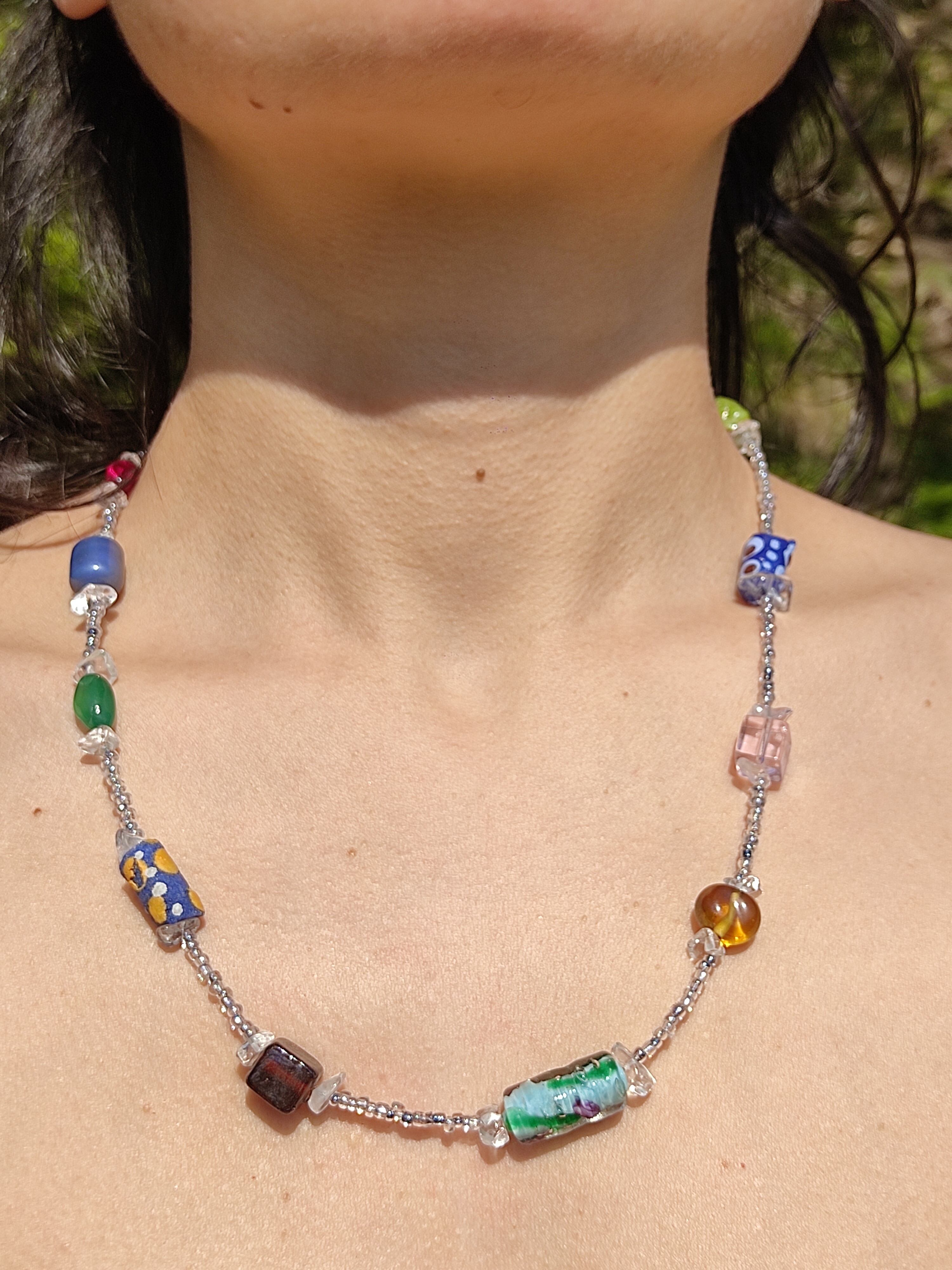 Necklace using vintage African beads, gemstones, acrylic and glass beads.