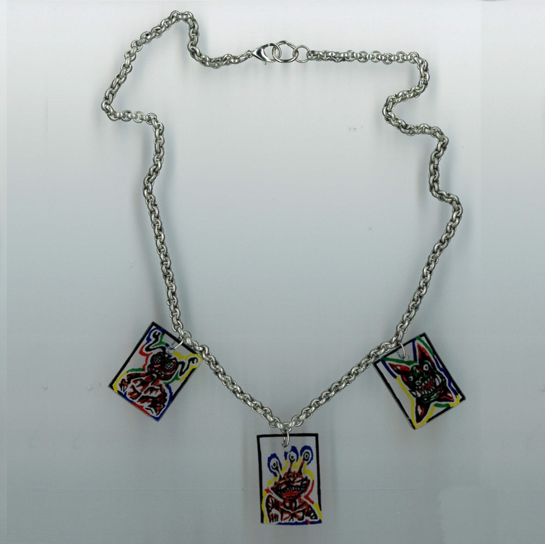 Upcycled chain, handmade /hand painted shrink plastic pendants.