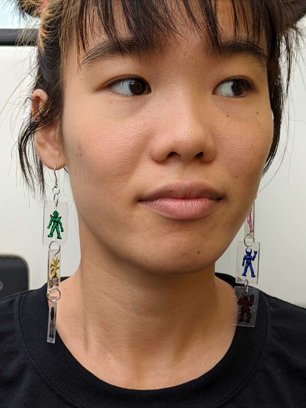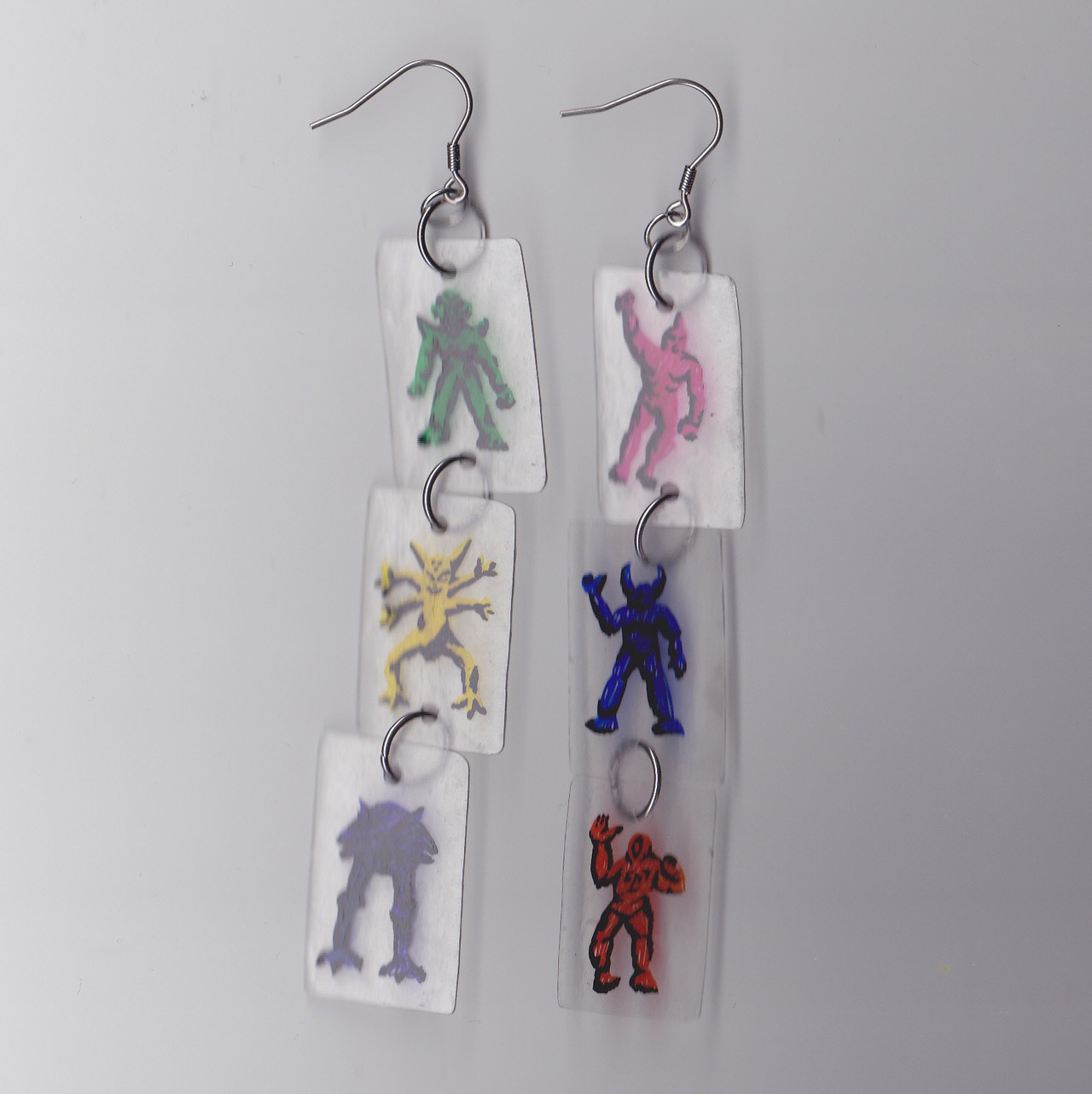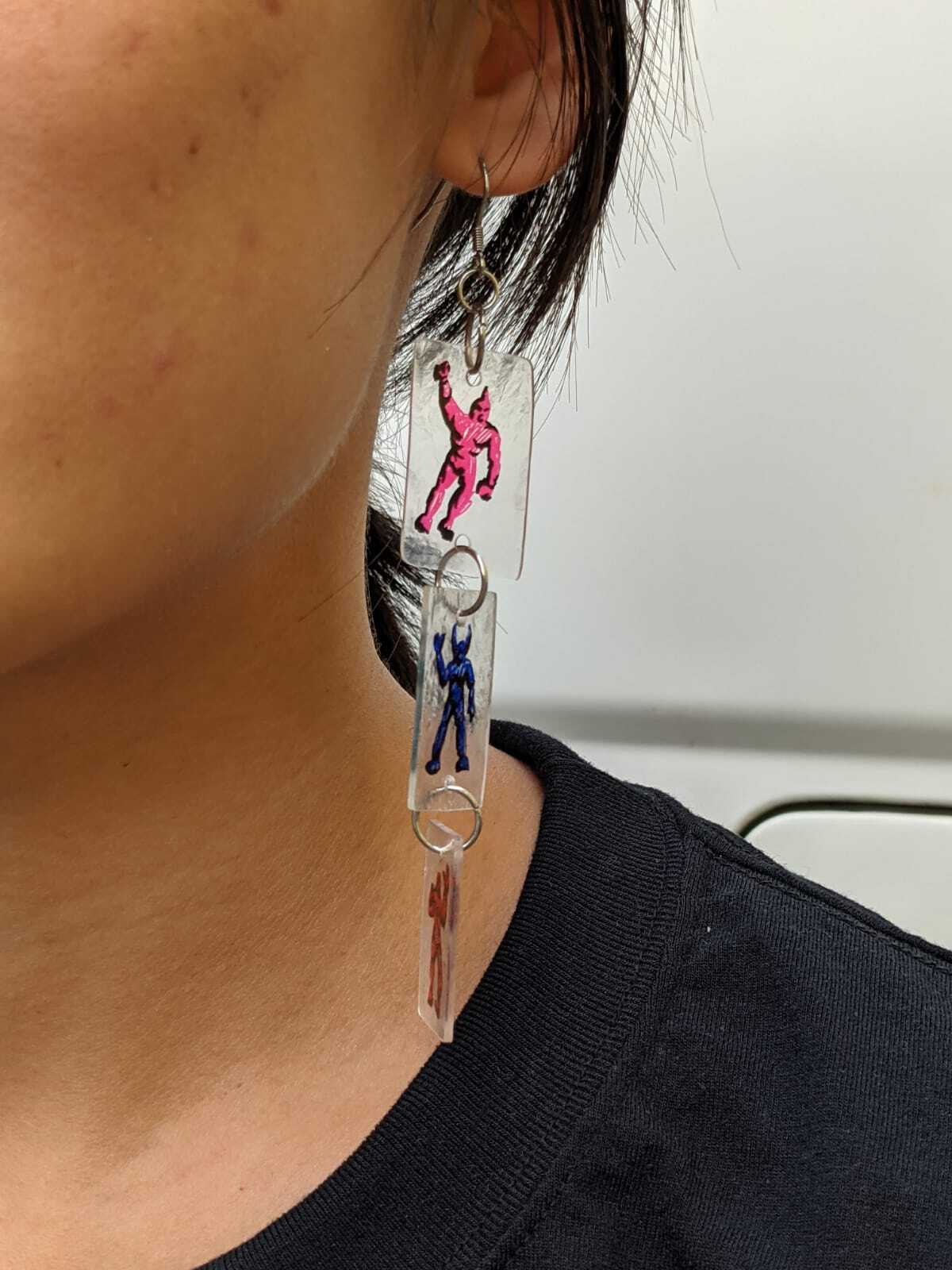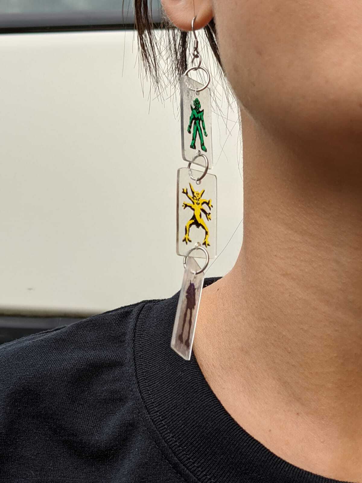使用済み弁当箱のふたを材料にして作ったプラ板、マーカー、サージカルステンレスフックを使用。(弁当箱を含むプラスチック包装は、再利用されない限り燃やされてから埋め立て地に送られます。Rankoジュエリーは、そのようなゴミを少しでも少なくすることを目標としています)