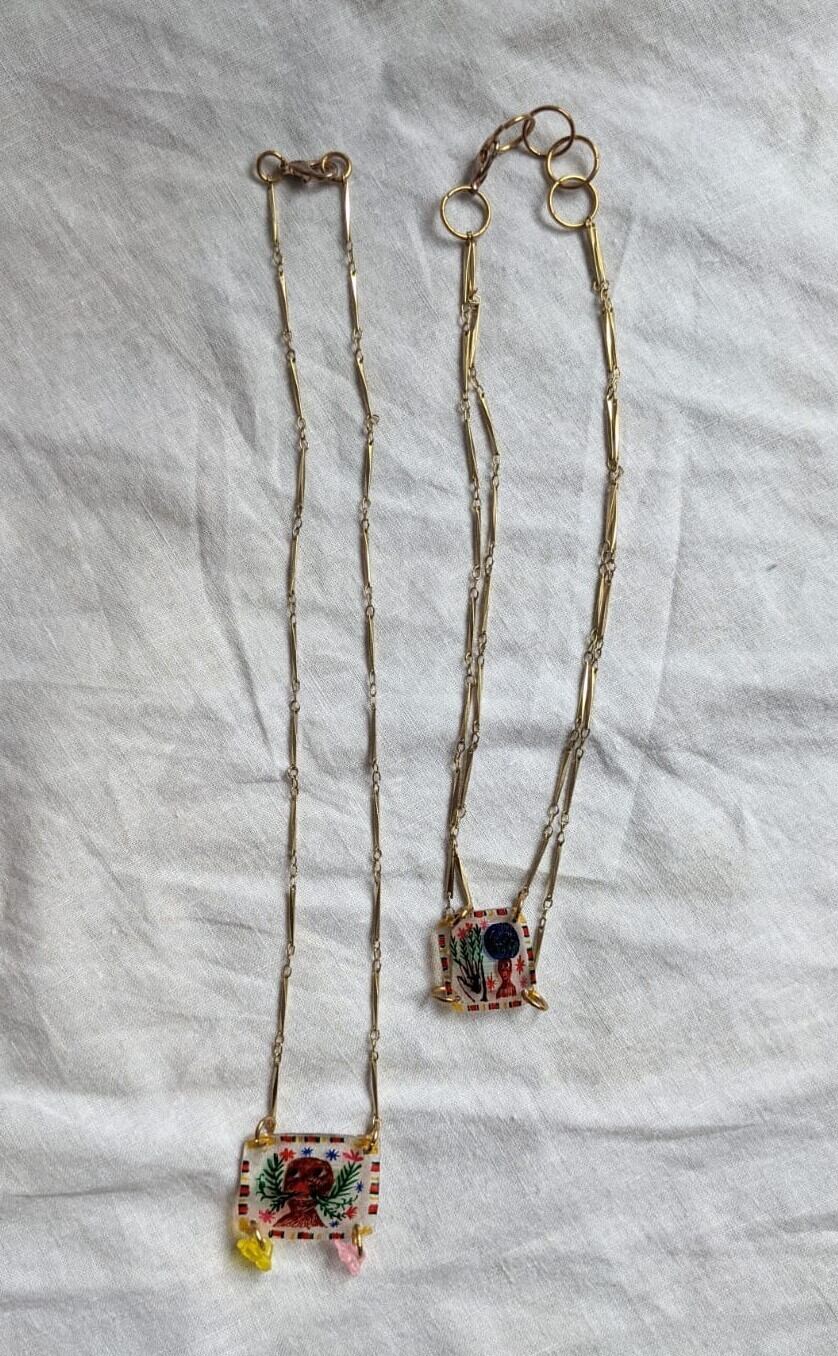 Upcycled chain, handmade & hand painted shrink plastic pendants made out of recycled tomato packaging (that would have otherwise been burnt or sent to the landfill; you can still see the barcode at the back!).