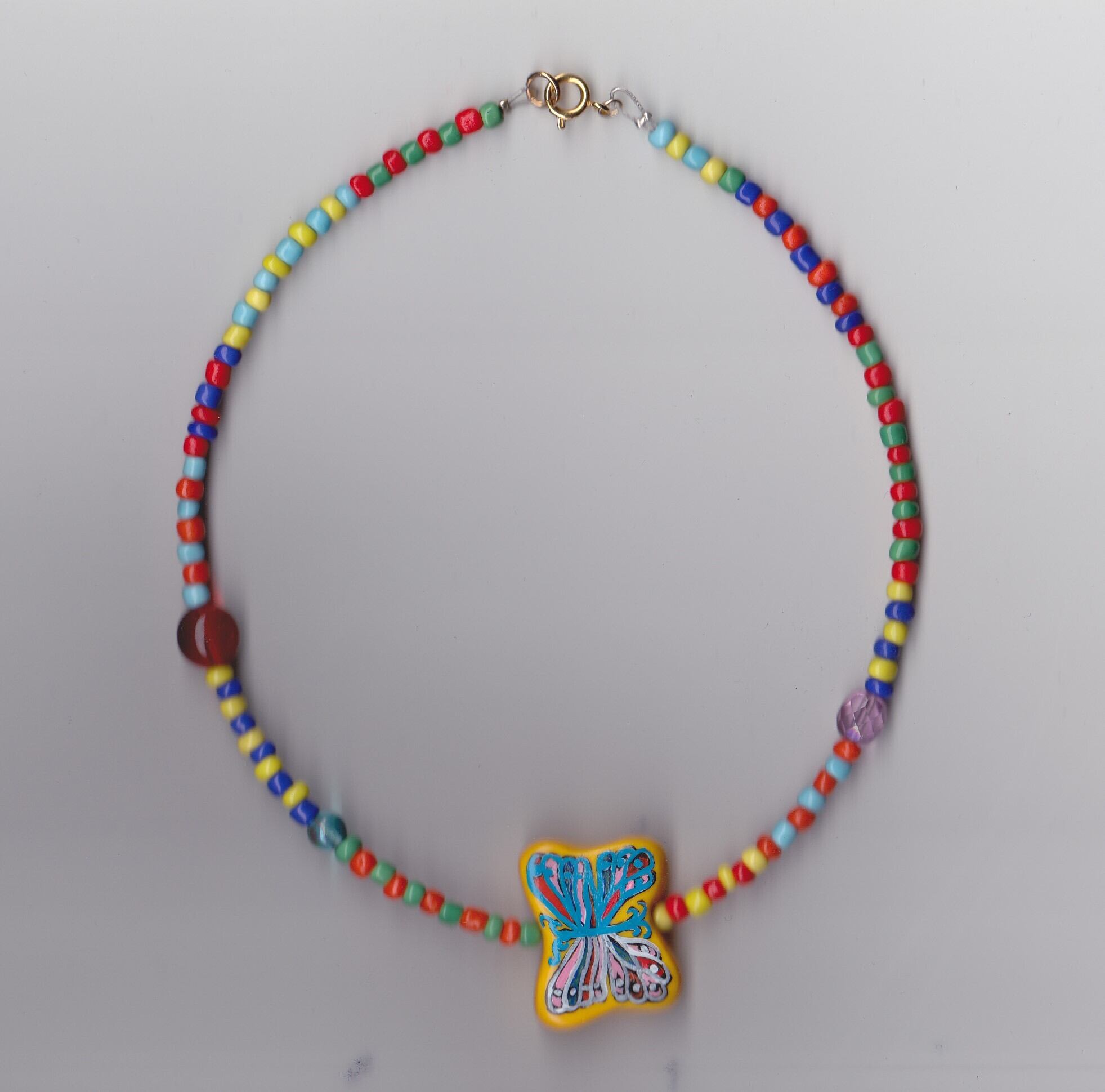 Made with a reversible hand-made/ hand-painted clay butterfly, and upcycled vintage beads.